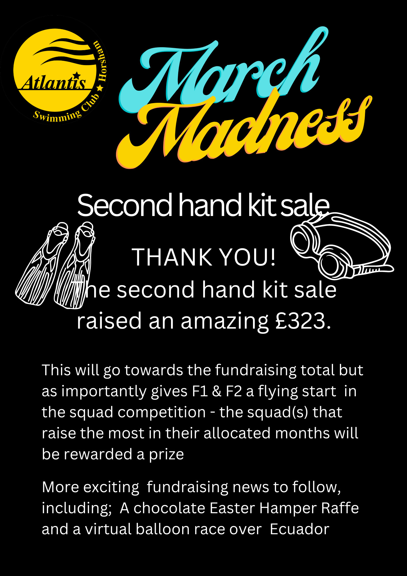 Thank you to everyone that supported that second hand kit sale at our March Madness Meet. It raised an amazing £323!